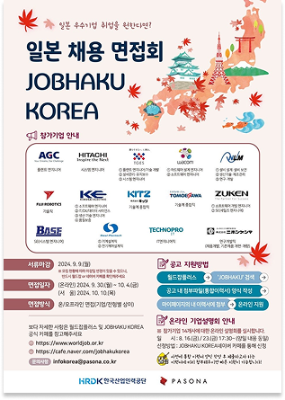 한국산업인력공단과 일본의 HR전문기업으로서 오랜 노하우를 보유하고 있는 파소나가 공동 주최하는 이공계 대상 일본 취업 면접회입니다. 일본의 우량 제조/IT 기업들이 신입~3년이하 기졸자 사원을 매년 모집합니다. 매년 가을 온라인 면접 혹은 서울에서의 대면 면접을 통해 우수한 국내 인재들을 채용합니다.